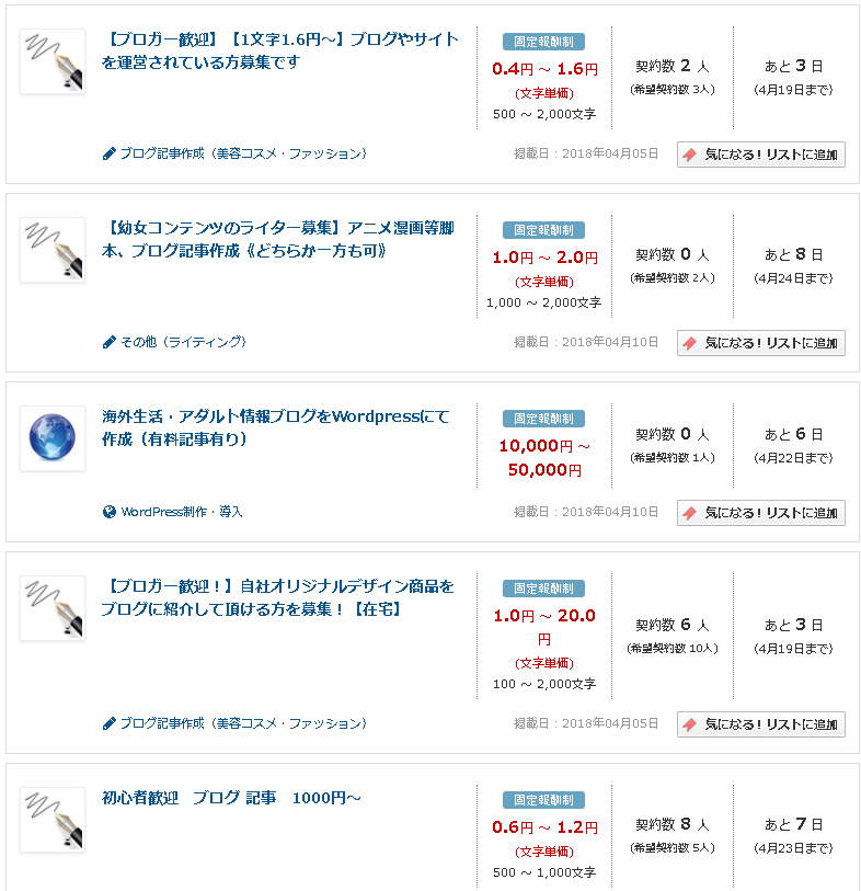 クラウドワークスの中には、在宅でできる仕事が多数掲載されていて、その中には「ブログの記事作成」の仕事が登録されています。